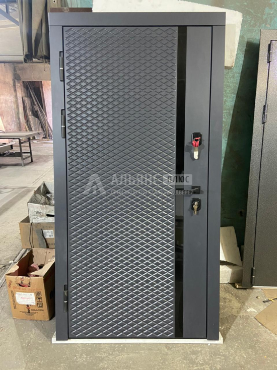 Конструкция двери включает прочный каркас из профильной трубы 50×25 мм и металлическое полотно толщиной 2 мм, что гарантирует долгосрочную эксплуатацию. Для дополнительной безопасности предусмотрены блокираторы, а два контура уплотнения обеспечивают защиту от шума и холода. В дверь можно добавить утеплитель на основе минваты или пенопласта, если требуется улучшить теплоизоляцию. В целом, эта дверь сочетает надежность и стиль, идеально подходя для различных типов помещений.